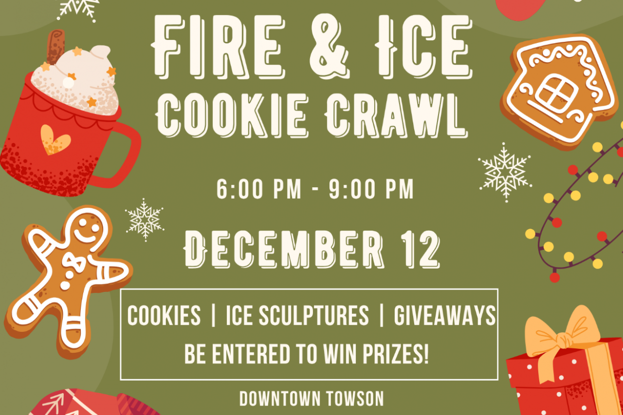 Experience the magic of winter in Towson at our Fire & Ice Night & Cookie Crawl! Enjoy an evening of dazzling ice sculptures, cozy fires, and sweet holiday treats as you explore downtown Towson