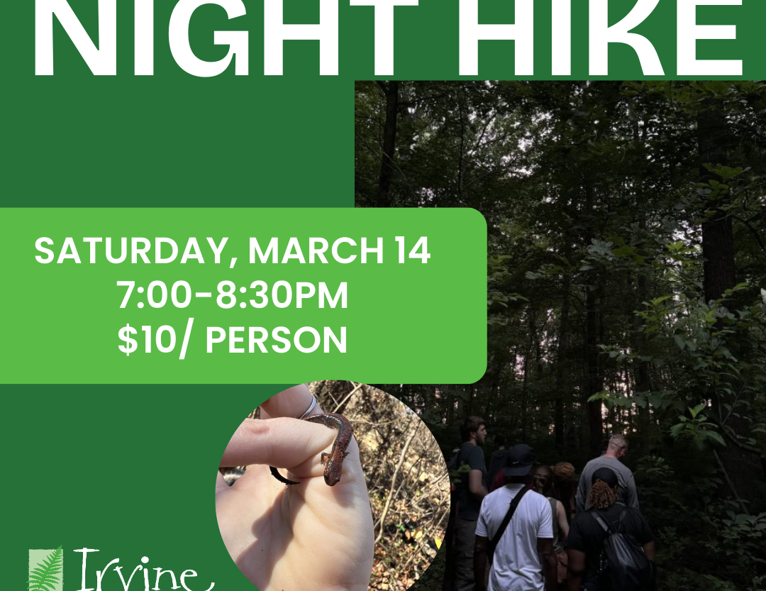 Join Irvine Animal Programs Manager Mallory Mlynarek for a fascinating glimpse into the lives of Irvine’s amphibians after dark! We will search for Spring Peepers, Wood Frogs, Salamanders, and many more If you have never heard the chorus of frogs in the springtime, this event is one you won’t want to miss! Ideal for ages 8