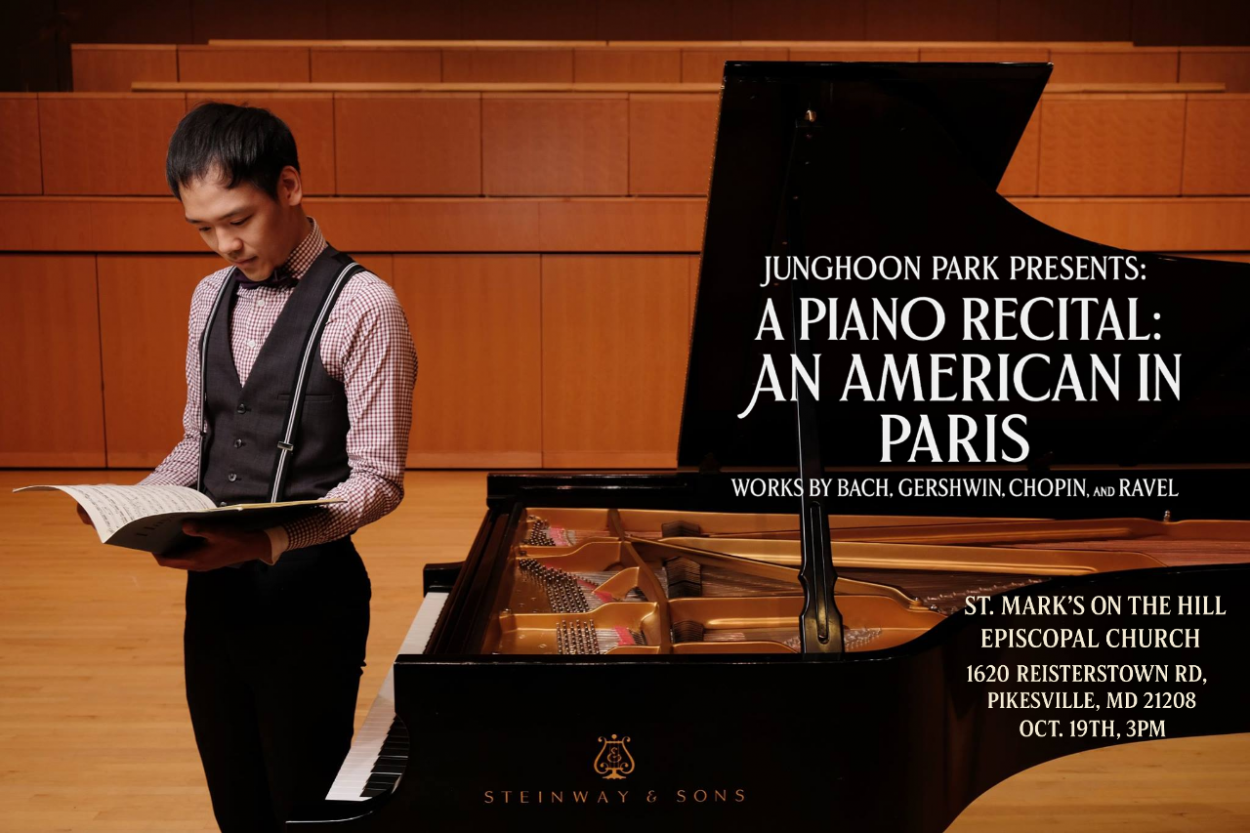 Piano Recital: An American in Paris Performed by Junghoon Park Works by Bach, Pershing, Chopin, and Ravel Admission: $20 requested offering at the door to support programs at St Mark’s on the Hill…