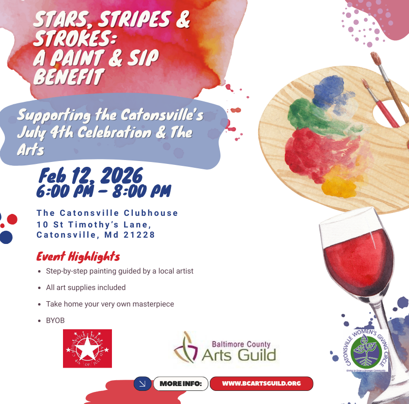 The Baltimore County Arts Guild, in partnership with the Catonsville July 4th Committee, presents a special Paint & Sip Benefit supporting Catonsville’s annual July 4th Celebration and local arts initiatives