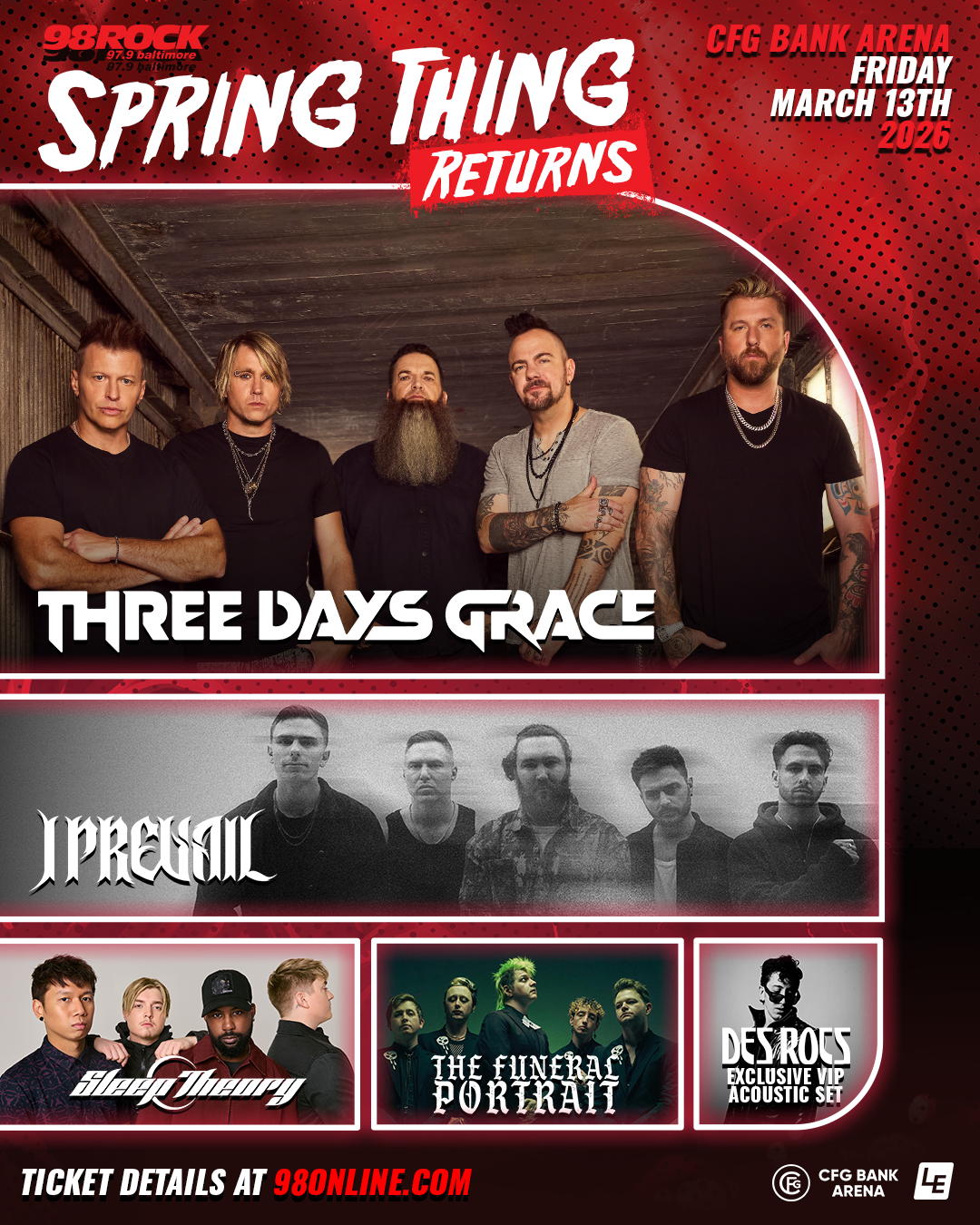 98 Rock Spring Thing is coming to CFG Bank Arena on Friday, March 13. Featuring Three Days Grace, I Prevail, Sleep Theory, and Funeral Portrait — one night of wall-to-wall rock energy you can’t miss. Tickets are on sale now!