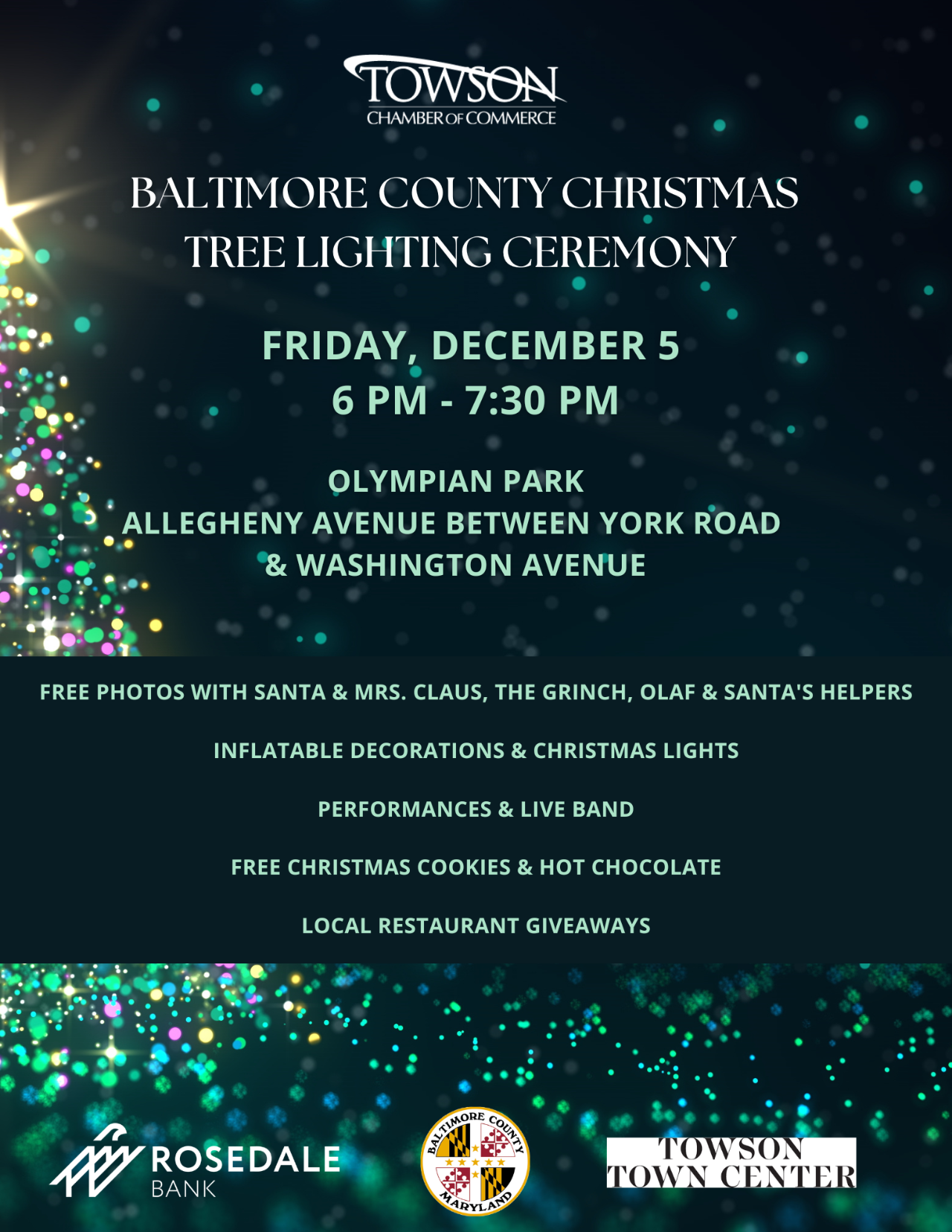 Kick off the holiday season at the Baltimore County Christmas Tree Lighting in the heart of downtown Towson! Join us for a joyful evening filled with twinkling lights, festive music, and community cheer as we officially light the beautiful Christmas tree in Olympic Park.