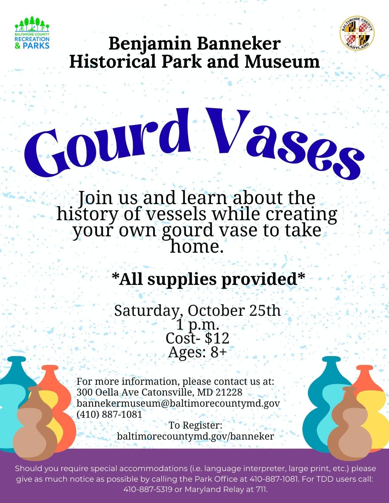 Join us to learn about the history of gourds as vessels while creating your own beautiful and functional gourd vase to take home. All supplies provided.