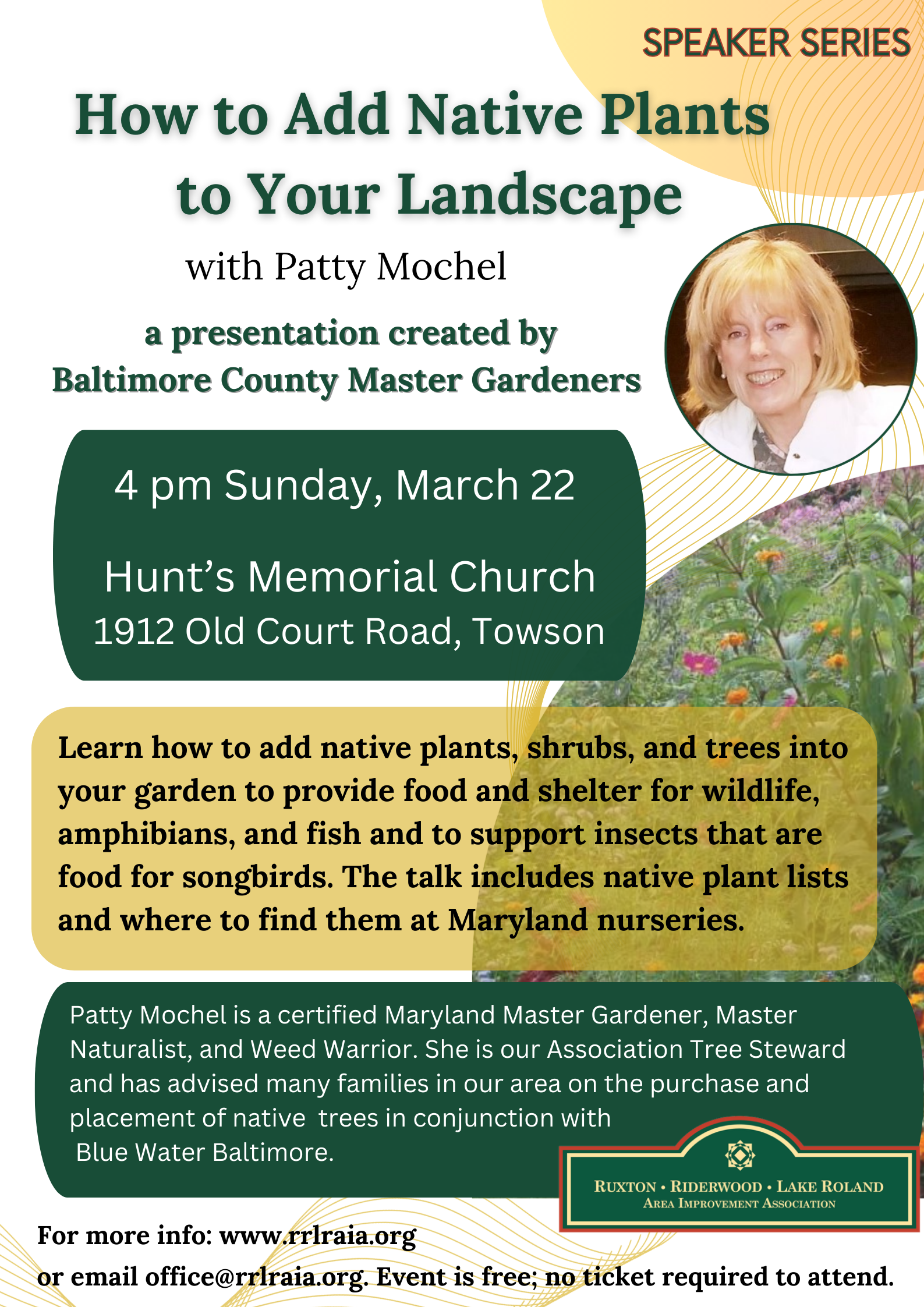 Join us on March 16 as Master Gardener Patty Mochel will speak about “Native Plants in your Landscape,” a presentation created by the Baltimore County Master Gardeners that explains the scientific research that documents the essential role that native plants play in the environment.