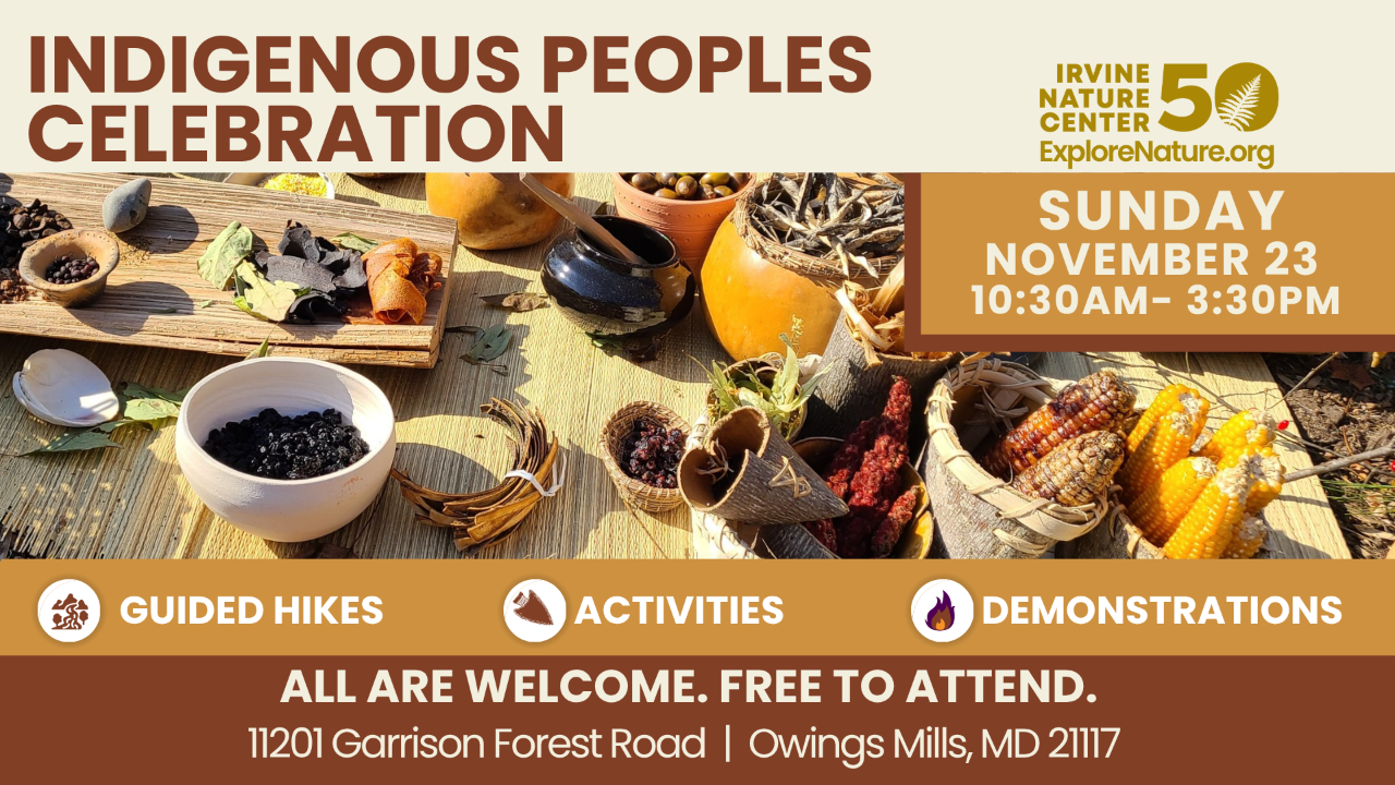 Irvine’s Native American Educational Site, built in partnership with the Baltimore American Indian Center, is a 15-minute walk from the parking lot. Guided hikes to the site will occur at designate times throughout the event, and the route will also be clearly marked for self-guided walks. Please provide advance notice if you require transportation to the site.