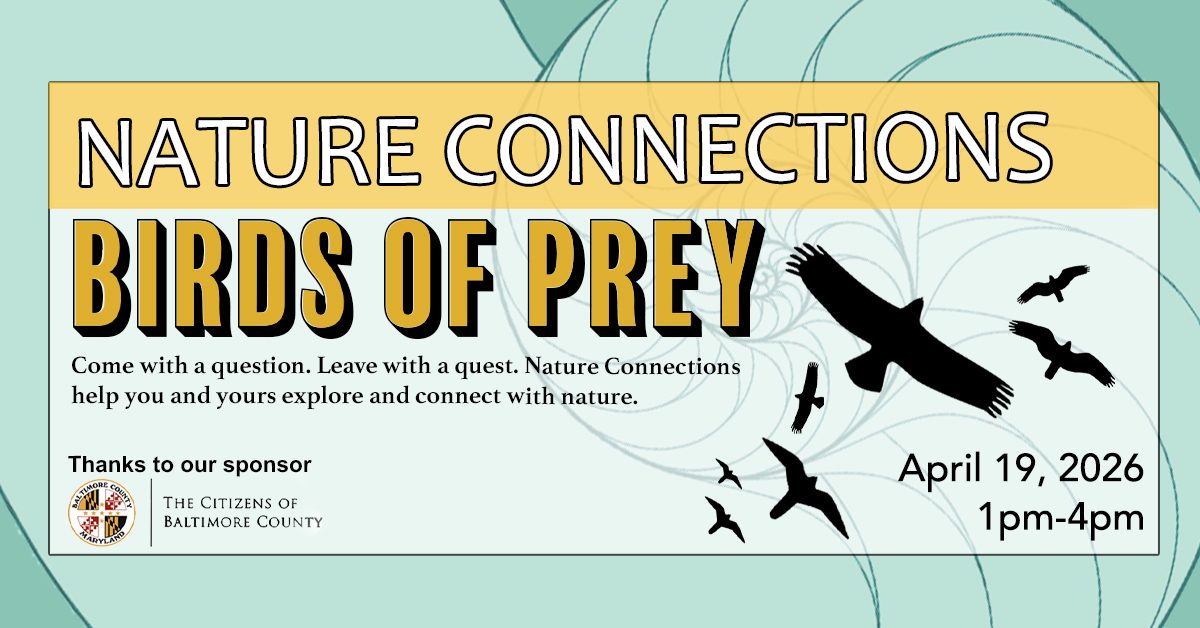 ABOUT NATURE CONNECTIONS: Nature Connections is a signature program offered to you by the Natural History Society of Maryland with financial support from the Citizens of Baltimore County. Programs, held on select Sundays, are free and open to the public. Each Nature Connection focuses on a different natural history topic.