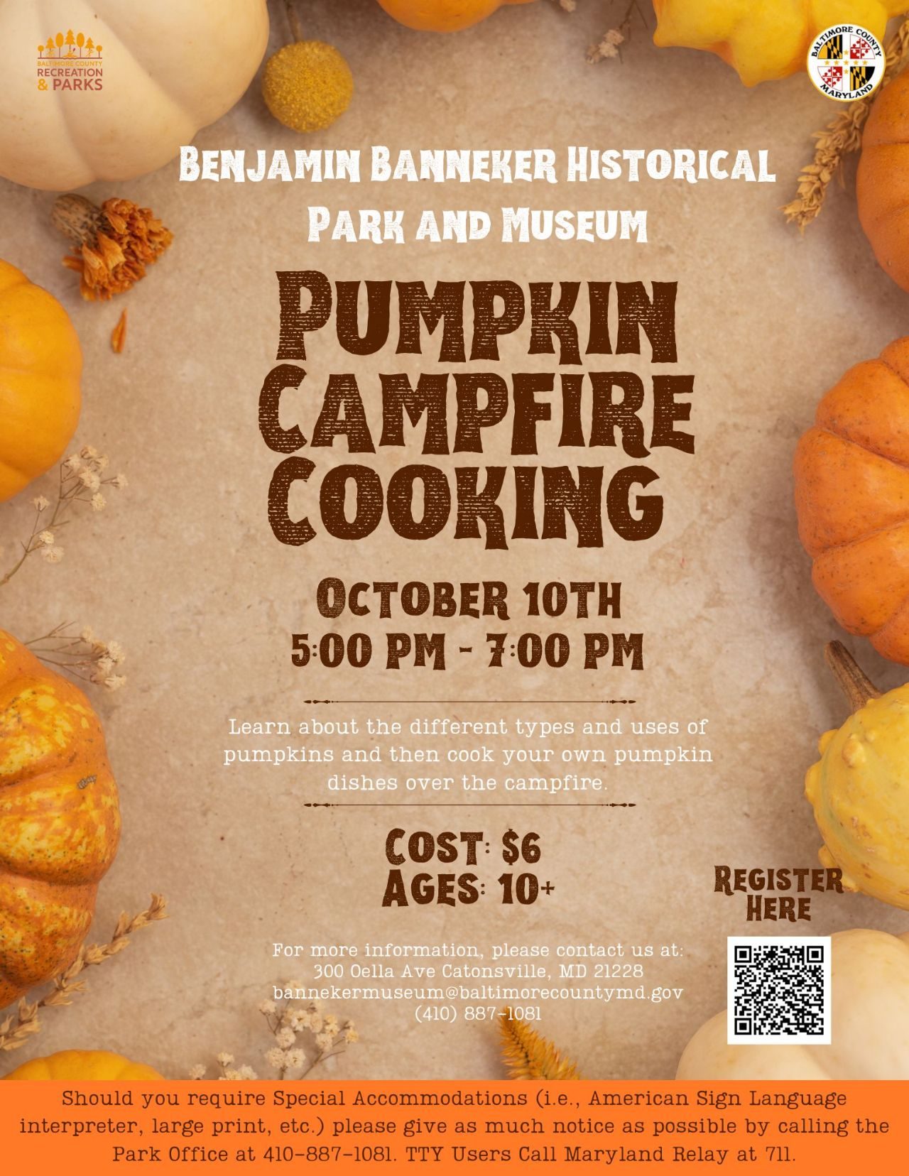 Pumpkins, pumpkins, everywhere… Come learn about the different types and uses of pumpkins and squashes historically grown for many centuries. Then cook your very own pumpkin dishes over a campfire. Remember to bring your own left-over boxes.