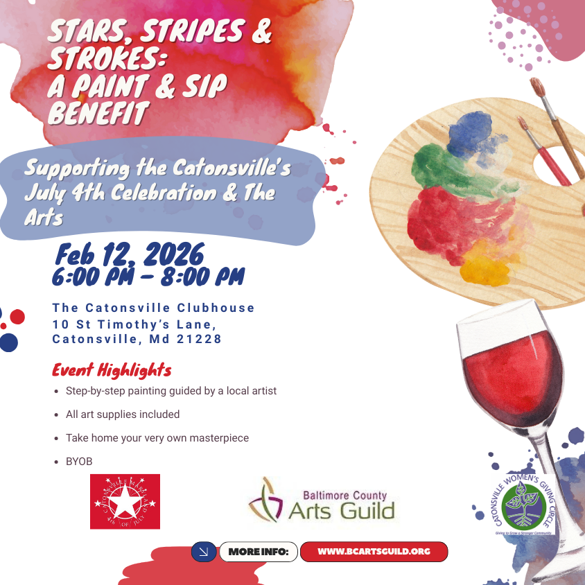 The Baltimore County Arts Guild, in partnership with the Catonsville July 4th Committee, presents a special Paint & Sip Benefit supporting Catonsville’s annual July 4th Celebration and local arts initiatives.