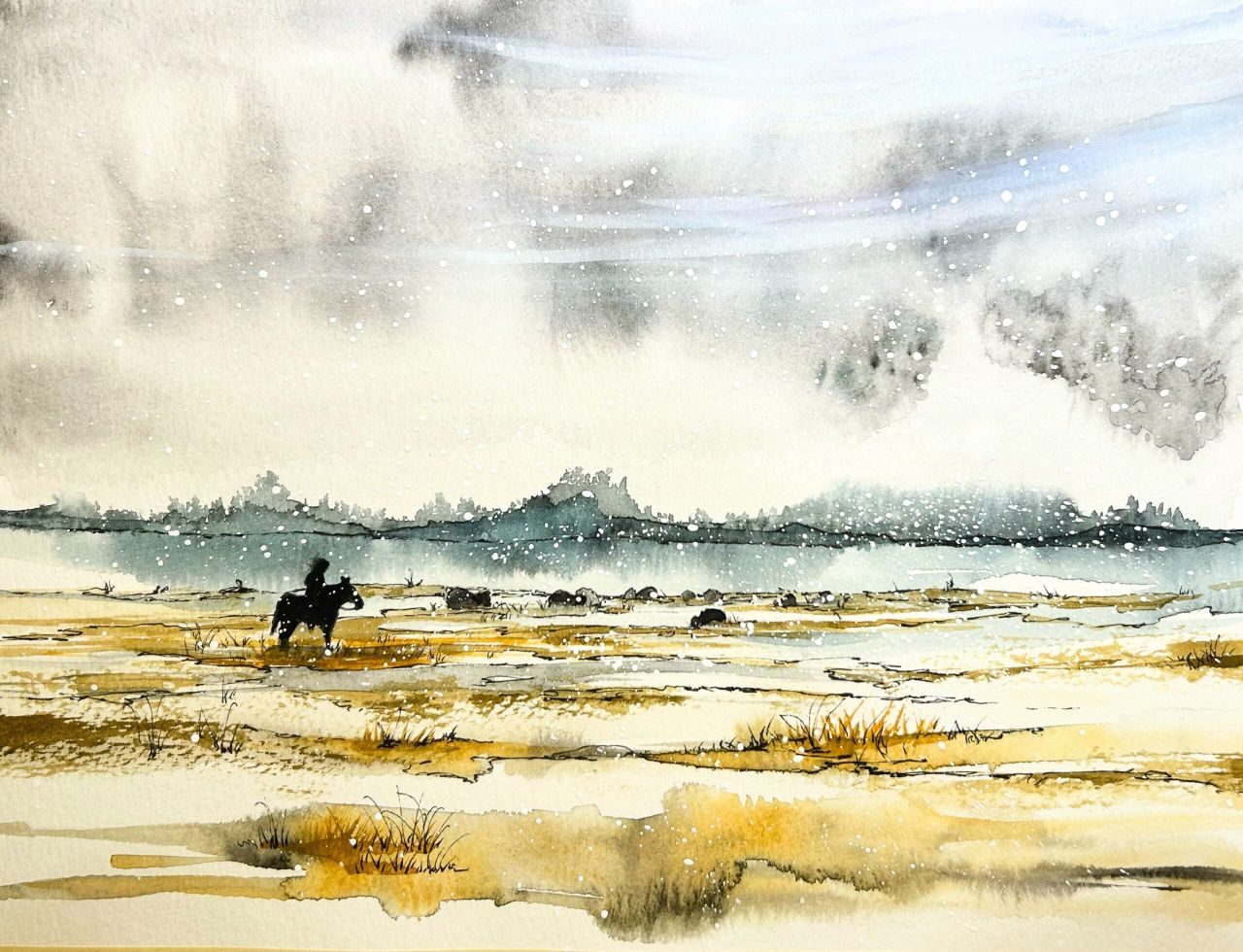 Watercolor paintings are typically protected under glass, but applying a layer of cold wax directly on your finished watercolor is a fun alternative and will protect your painting without the typical glare of glass. Because the cold wax contains no water, it can be applied directly to the watercolor painting and will not redissolve the paint. We’ll create a winter pasture scene using wet-in-wet techniques, waterproof ink for details, and a splatter effect to create snow. Then we’ll apply a cold wax coating to protect our paintings which can be framed without glass.