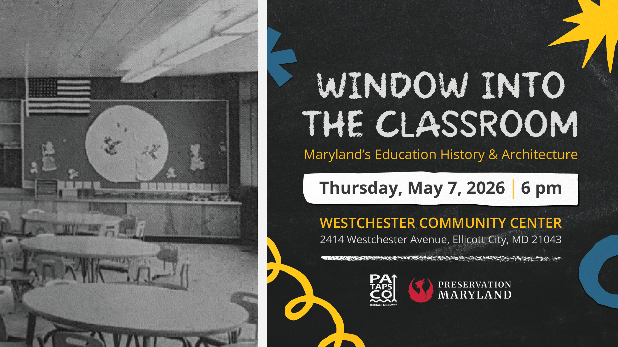 Join Patapsco Heritage Greenway and Preservation Maryland for Window into the Classroom. During this in-person presentation, Christiana Limniatis, Preservation Maryland’s Program & Outreach Manager, will talk about the advocacy effort that lead to the development of Maryland’s first ever historic context study detailing Maryland’s education history and architecture, discuss the evolution of public schools over time, and highlight some of the historic places associated with this rich heritage of educational architecture.